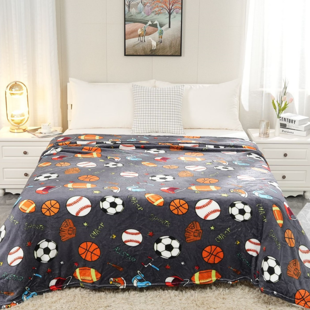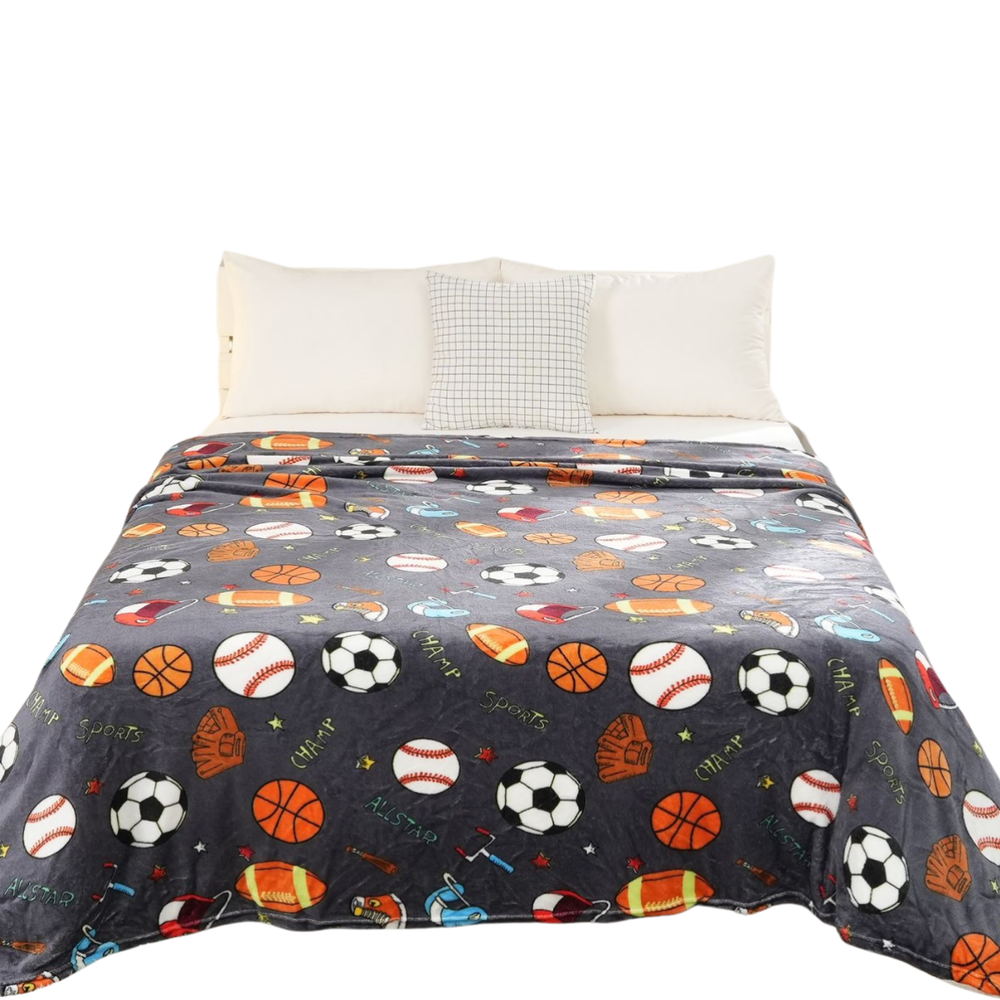 Frazada Luxury All Star Sports Matrimonial Medida 190x230 cm. Diseño con balones de futbol, béisbol y básquetbol. Enérgico y divertido, pensado para niños o adolescentes deportistas. Su textura extra suave y ligera brinda una sensación de abrigo perfecto durante todo el año, mientras su color azul profundo aporta tranquilidad y estilo a la habitación.