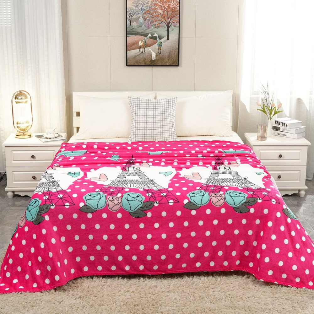 Frazada Luxury Paris Love Matrimonial Medida 190x230 cm. Fondo rosa con corazones y la Torre Eiffel. Romántico y chic, perfecto para quienes aman los diseños parisinos. Su textura extra suave y ligera brinda una sensación de abrigo perfecto durante todo el año, mientras su color azul profundo aporta tranquilidad y estilo a la habitación.