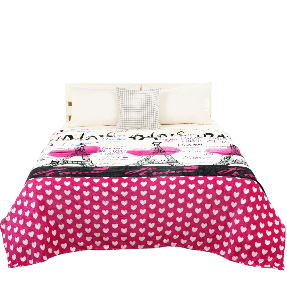 Frazada Luxury Paris Bloom Matrimonial Medida 190x230 cm. Inspirado en la Torre Eiffel con rosas y puntos blancos. Romántico y juvenil, ideal para quienes buscan un toque romántico francés. Su textura extra suave y ligera brinda una sensación de abrigo perfecto durante todo el año, mientras su color azul profundo aporta tranquilidad y estilo a la habitación.