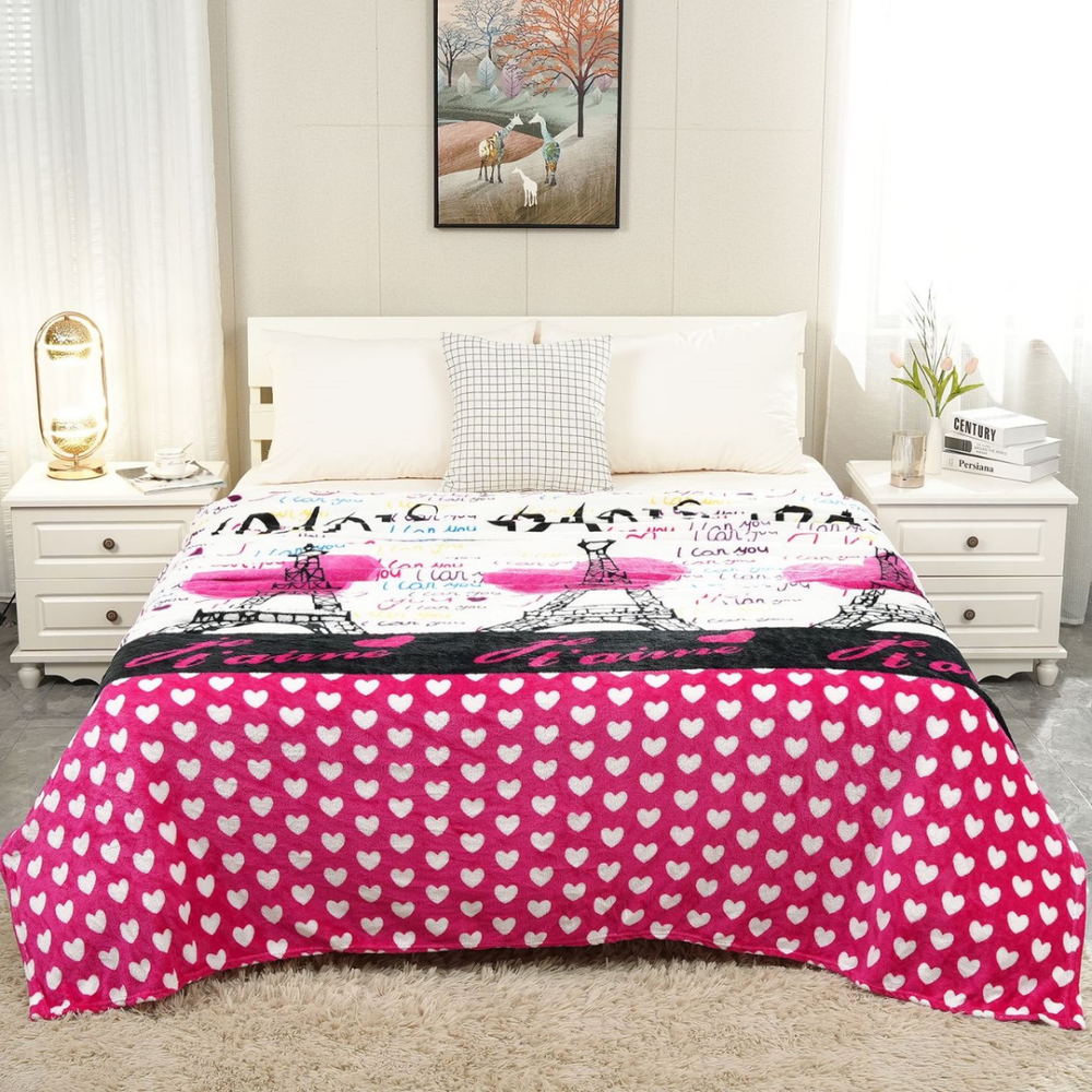 Frazada Luxury Paris Bloom King Size Medida 220x230 cm. Inspirado en la Torre Eiffel con rosas y puntos blancos. Romántico y juvenil, ideal para quienes buscan un toque romántico francés. Su textura extra suave y ligera brinda una sensación de abrigo perfecto durante todo el año, mientras su color azul profundo aporta tranquilidad y estilo a la habitación.